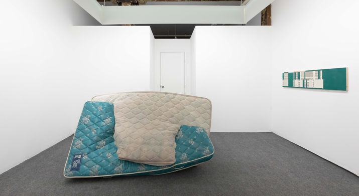 "Dandara Catete, a promising young Brazilian artist currently based in Madrid, has made a new work in situ – a twisting clinch of two disused mattresses. With aging, soiled, quilted surfaces, the mattresses swirl in an embrace that vacillates between poignant tenderness and abject violence.“